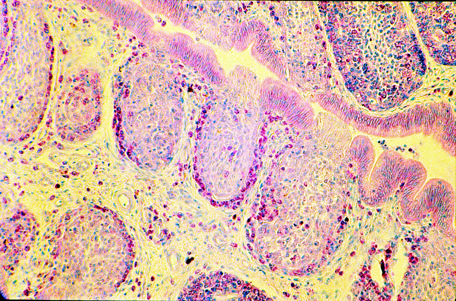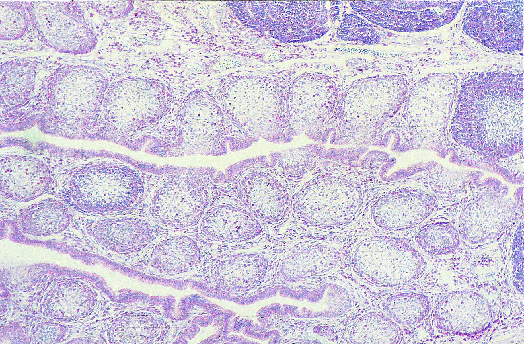 Reconstitution of cyclophosphamide depleted bursal follicles and effects of constitutive over expression of Myc and other transgenes in chickens. Images from “An atlas of normal and Myc-induced neoplastic development in the bursa of fabricius.” Access the full Atlas at http://authors.fhcrc.org/368