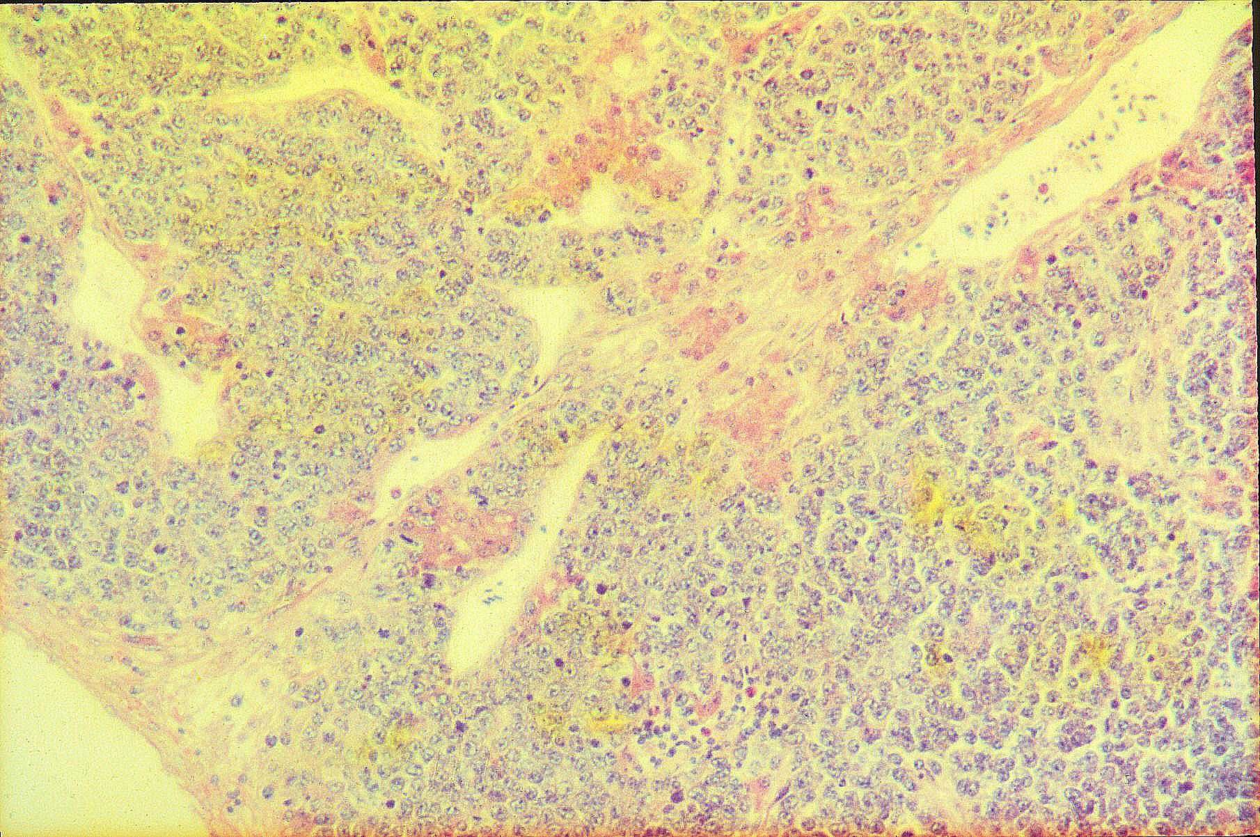 [thumbnail of 104. Liver tumor, HB1 Myelocytomasis virus infected bird H&E] Image (104. Liver tumor, HB1 Myelocytomasis virus infected bird H&E)